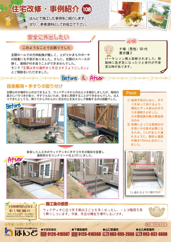 パーキンソン病と診断されたF様。玄関の段差、介助スペースの確保などの点から、安全に外出できるよう、玄関ではなく「ウッドデッキ」からの出入りをご提案した事例を紹介します。