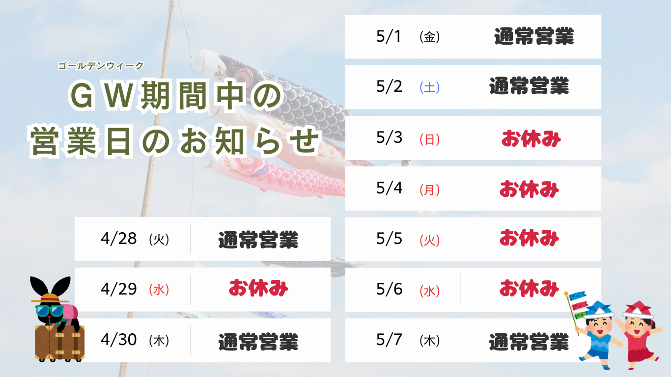 ゴールデンウィーク期間中の営業日のお知らせ