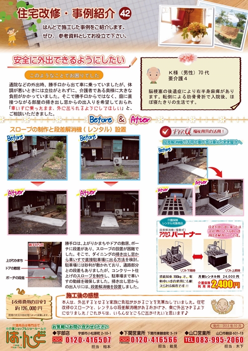 山陽小野田市のK様は、ほとんど寝たきりの状態です。通院などで外出する際は、庭に直接出ることができる部屋の掃き出し窓から出入りしたいと希望されています。しかし、高い段差があるため、車いすのまま出かけることは困難です。そこで、福祉用具レンタルの段差解消機を設置し、その先には住宅改修でスロープを製作。安全に車いすのまま外出できるように環境整備をしました。