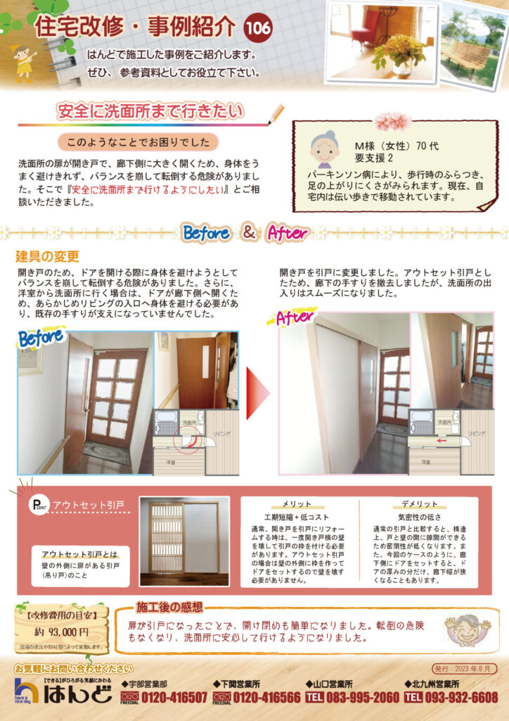 パーキンソン病により、歩行時のふらつきや足の上がりにくさがみられるM様。洗面所の扉が廊下側に大きく開くため、身体を避けようとしてバランスを崩し転倒の危険がありました。「安全に洗面所まで行けるようにしたい」とご相談をいただいた事例をご紹介します。
